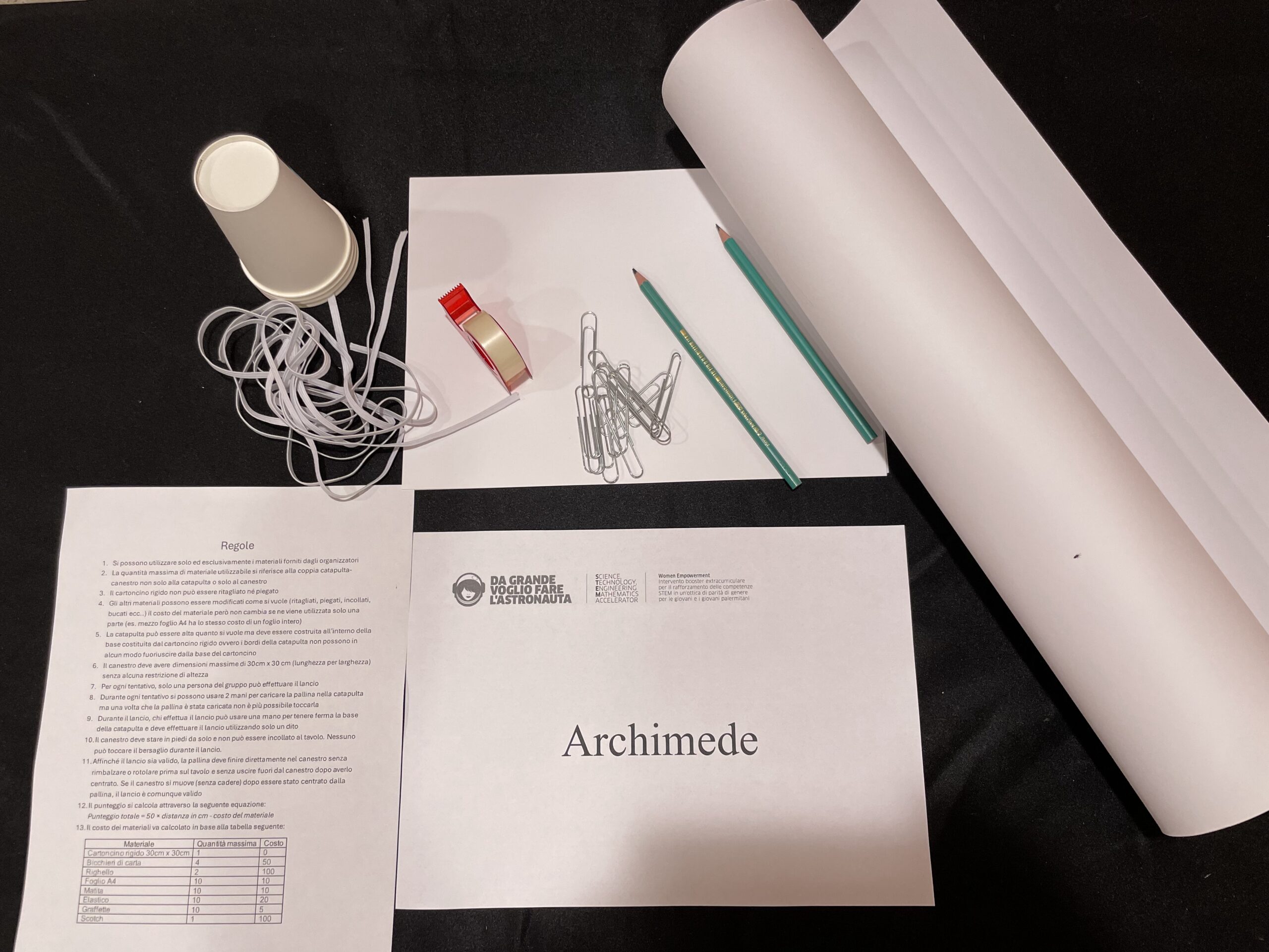 Le squadre ricevono i materiali e una scheda che riassume le regole della sfida. L’obiettivo è costruire una catapulta che sia in grado di lanciare una pallina di carta stagnola e centrando un bersaglio alla più grande distanza possibile.Le squadre dovranno progettare sia la catapulta sia il bersaglio rispettando i vincoli specificati nella scheda riassuntiva.Alle squadre viene dato un tempo per progettare e testare la soluzione al termine del quale ogni squadra dovrà effettuare un lancio ufficiale. Durante il lancio ufficiale ogni squadra avrà a disposizione 5 tentativi e verrà considerato il migliore tra i cinque. La lunghezza raggiunta in cm verrà utilizzata come base per calcolare il punteggio a cui andrà sottratto il “costo” degli eventuali materiali opzionali utilizzati. Vince chi totalizza il punteggio più alto.