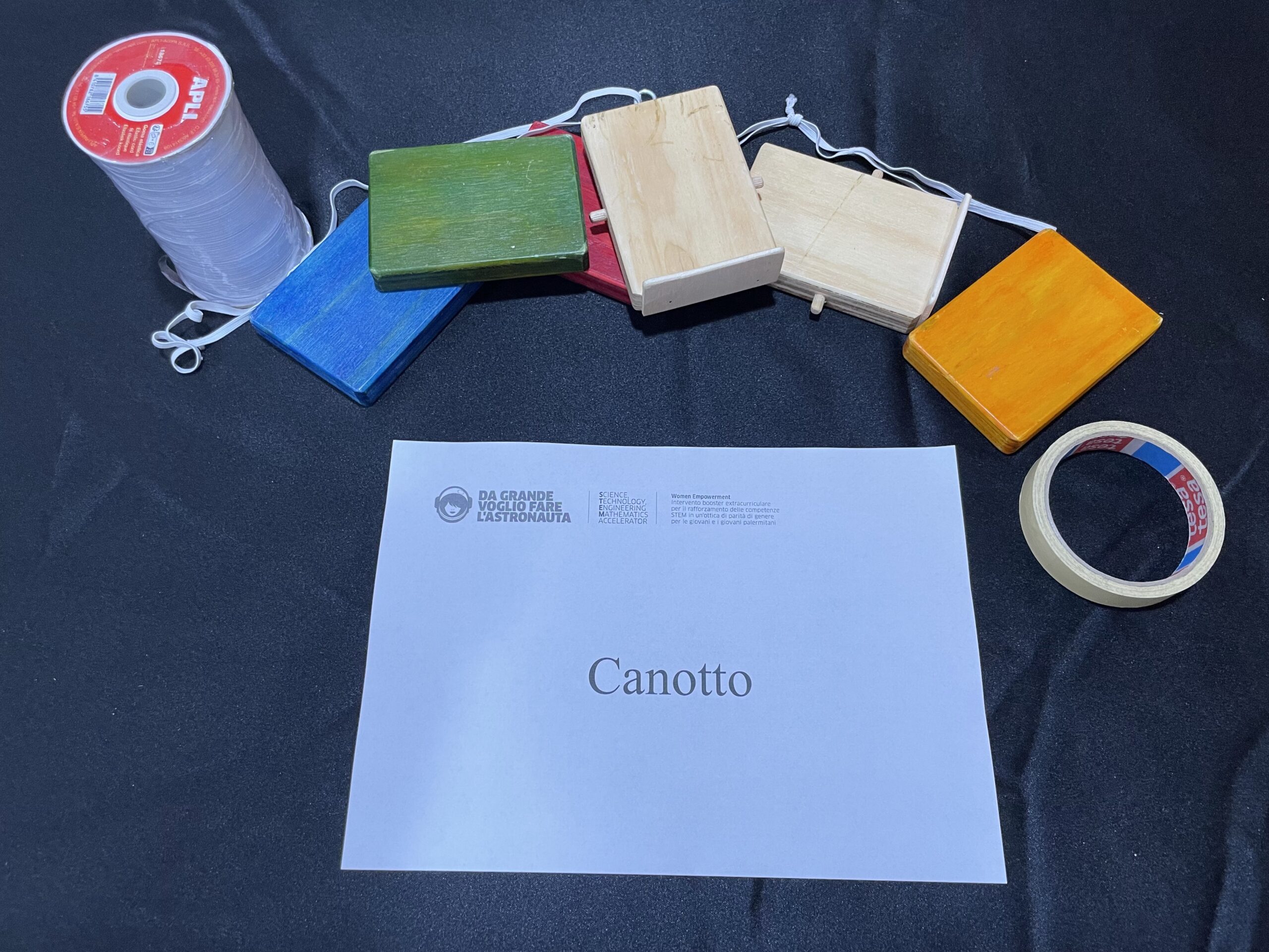 Appositi set di blocchi di diversi coloriTavolo lungoNastro adesivo di carta per delimitare la zona vittoria del campo da giocoBarra di legno con appositi perni da fissare al centro del tavolo collegata ad apposito blocco traino di legno tramite elastico