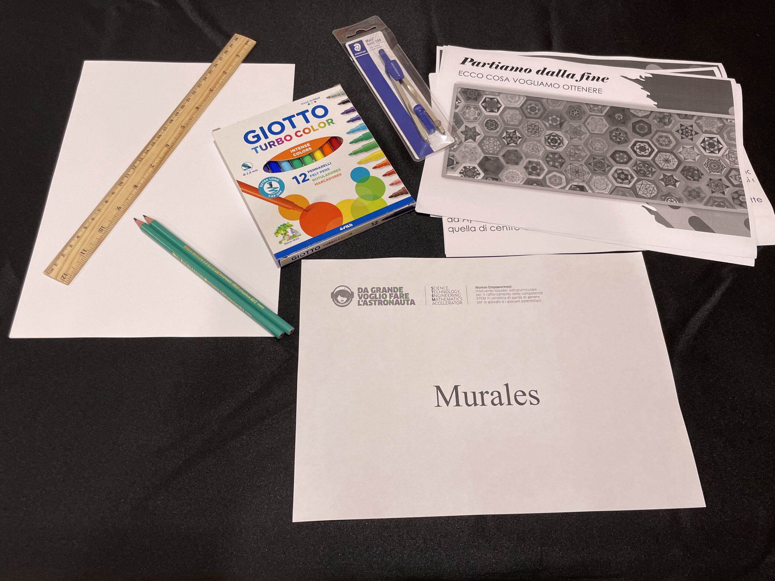 Appositi kit con le istruzioni per creare il motivo geometricoFogli di cartaRigheCompassiColori