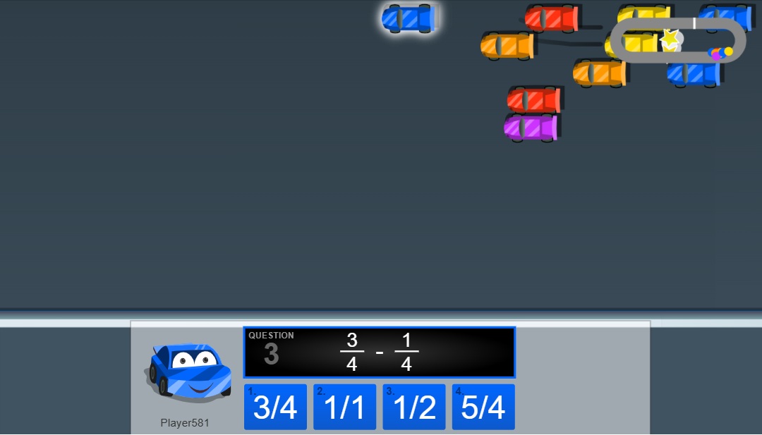 L’organizzatore fornisce ai partecipanti il seguente link: https://www.mathplayground.com/ASB_Speedway.html a tale link è possibile avviare il gioco online sia in modalità gruppo (viene creata una gara accessibile a tutti e i partecipanti si iscrivono) sia in modalità singola (ognuno gioca da solo indipendentemente dai compagni). La modalità singola può essere utilizzata per un riscaldamento in seguito al quale viene avviata una gara in modalità gruppo. Si tratta di una gara automobilistica online: al via il software presenta ai partecipanti delle semplici operazioni con le frazioni a risposta multipla. Se la risposta selezionata è corretta la propria macchina accelera se no rallenta.